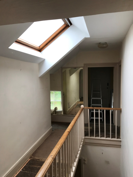 Externally needed work to stop water penetration causing damp problems inside. This involved new chimney stacks; hardwood doors and sliding sash windows; sandblasting, re-pointing, cement waterproofing and painting of the external walls; new cast aluminium guttering and a new porch to the rear. An air source heat pump and solar panels were installed to modernise the heating system.